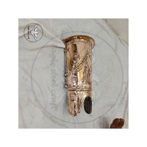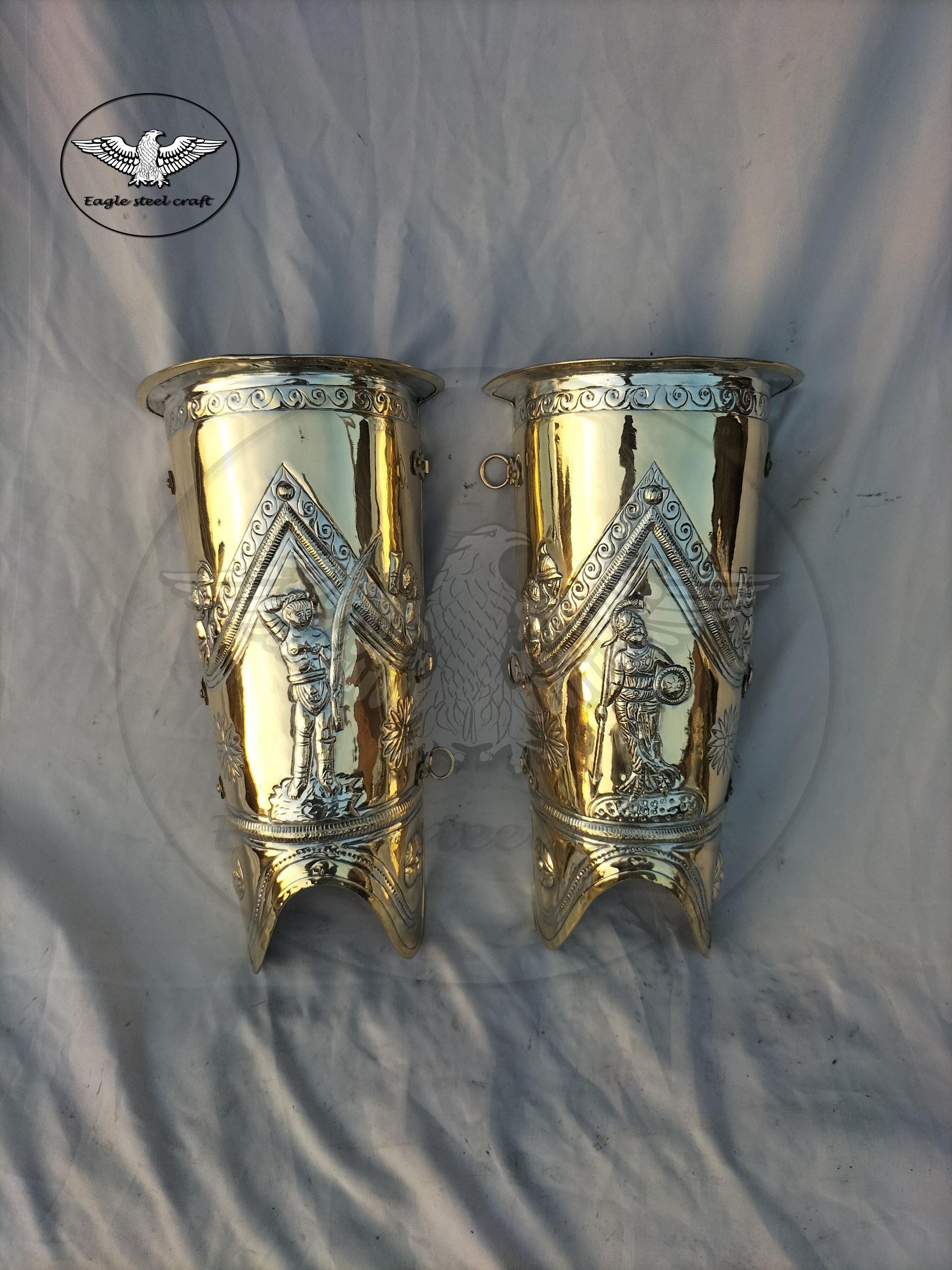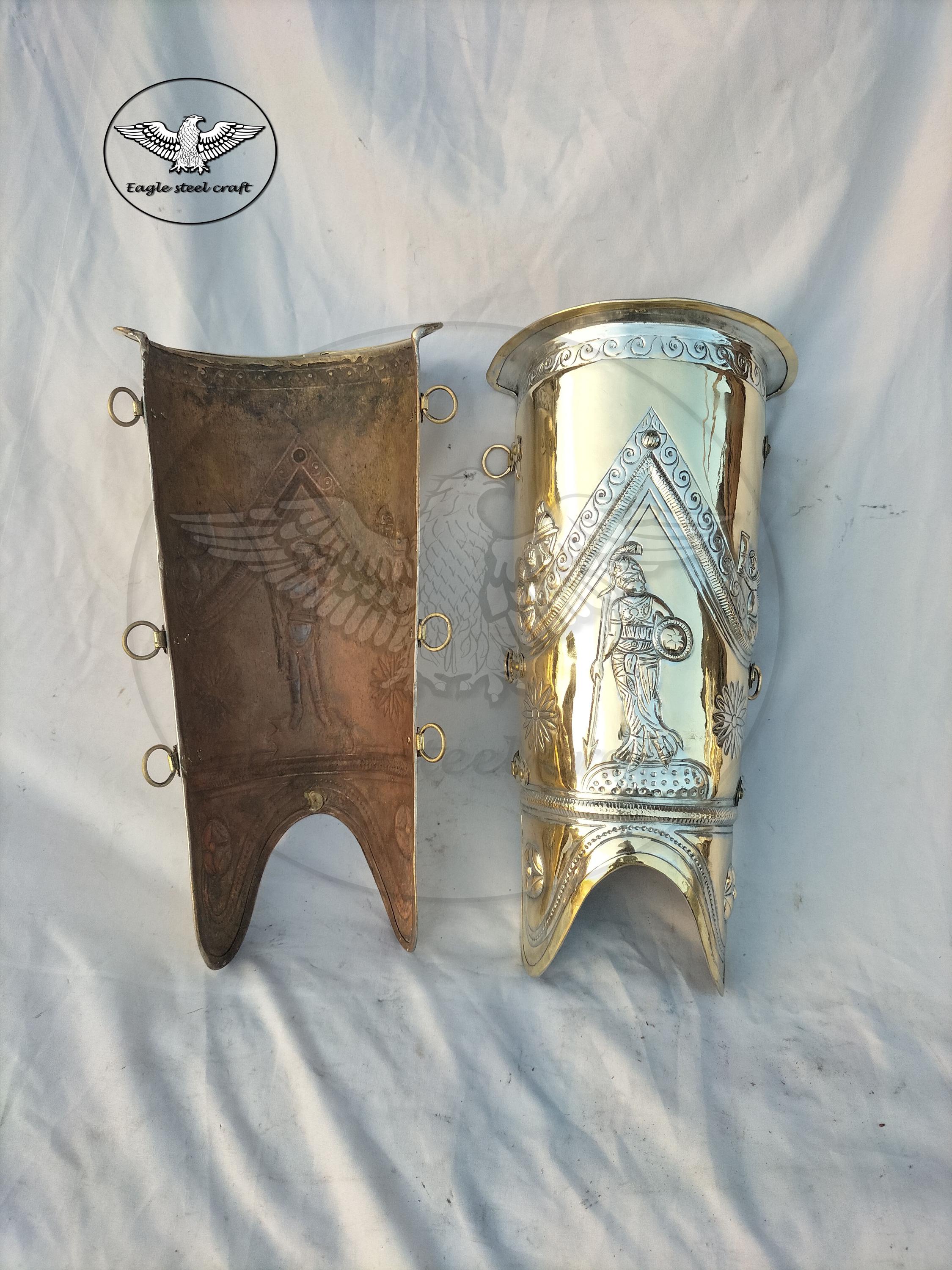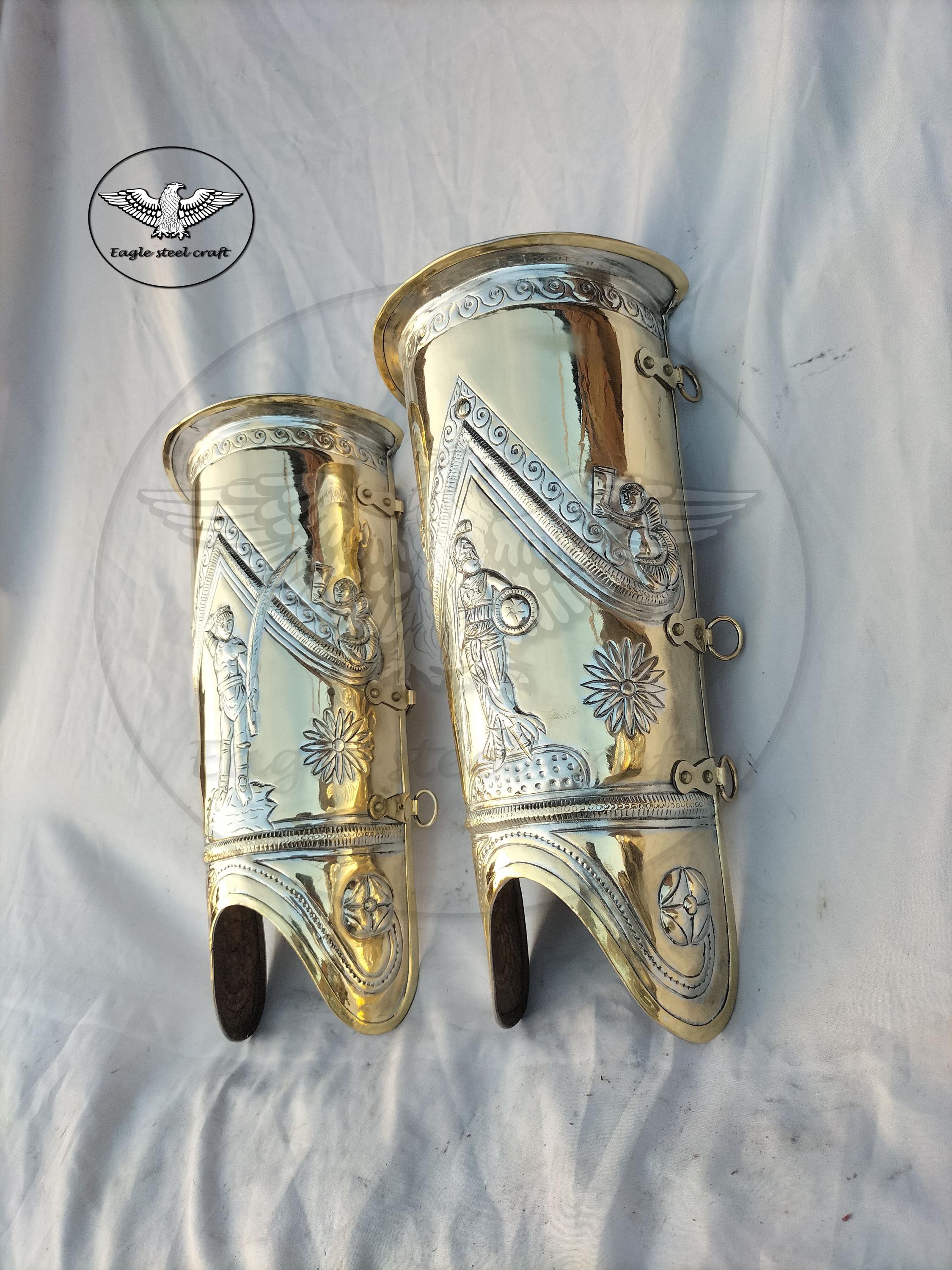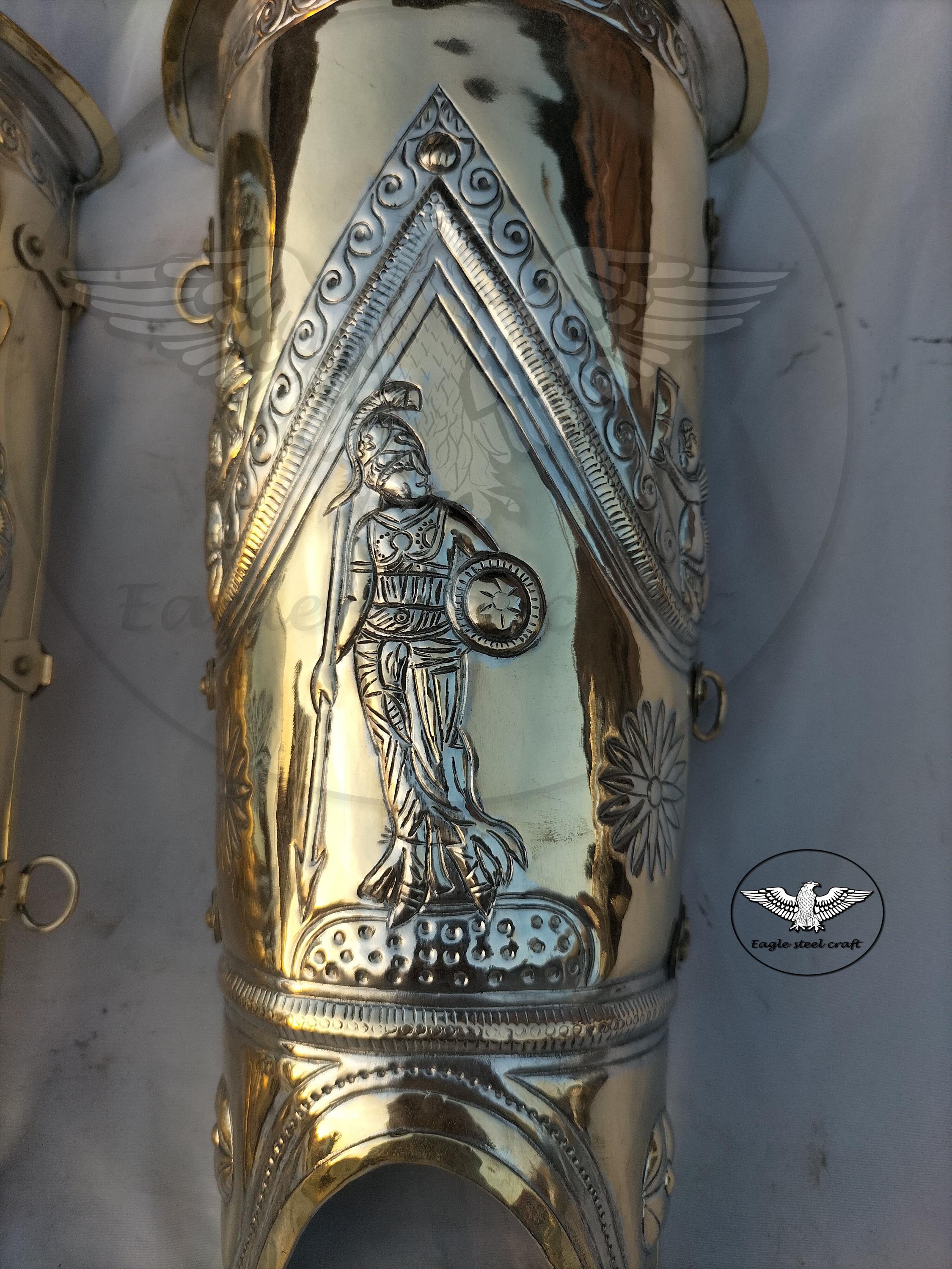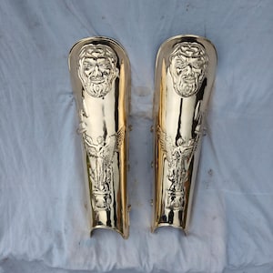 Roman gladiator shin guard depicting Hercules 1st century. Made in 1.5 mm solid brass material for reenactment. with all handmade embossing design. best for use in gladiator reenactment SIZE :- Length 28 cm. You an tell me your leg size when you buy it i will customize all the size according to you. made by - Eagle steel handicraft