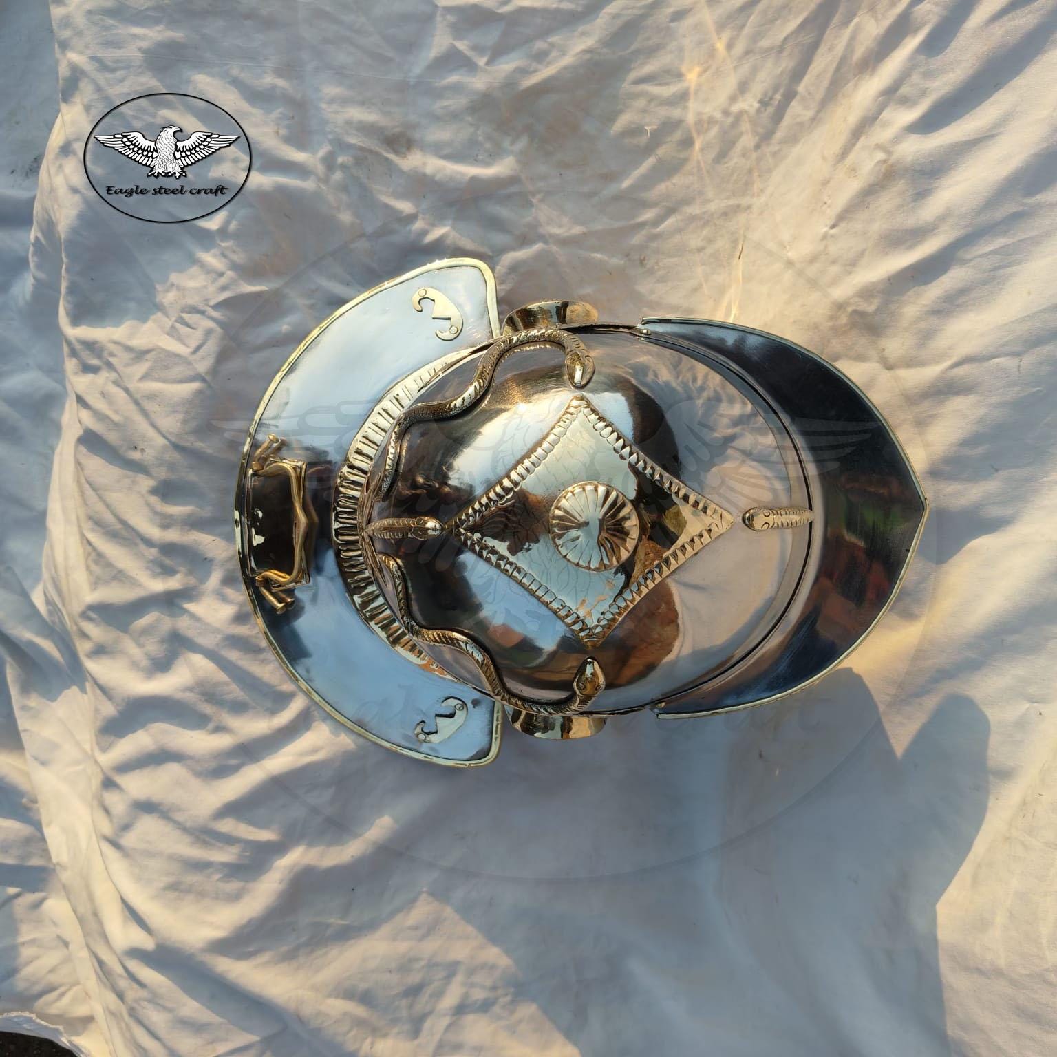 -The helmet is manufactured to thickness 1.2mm (18 gauge) steel and 1.2mm brass work added onto the steel helmet.