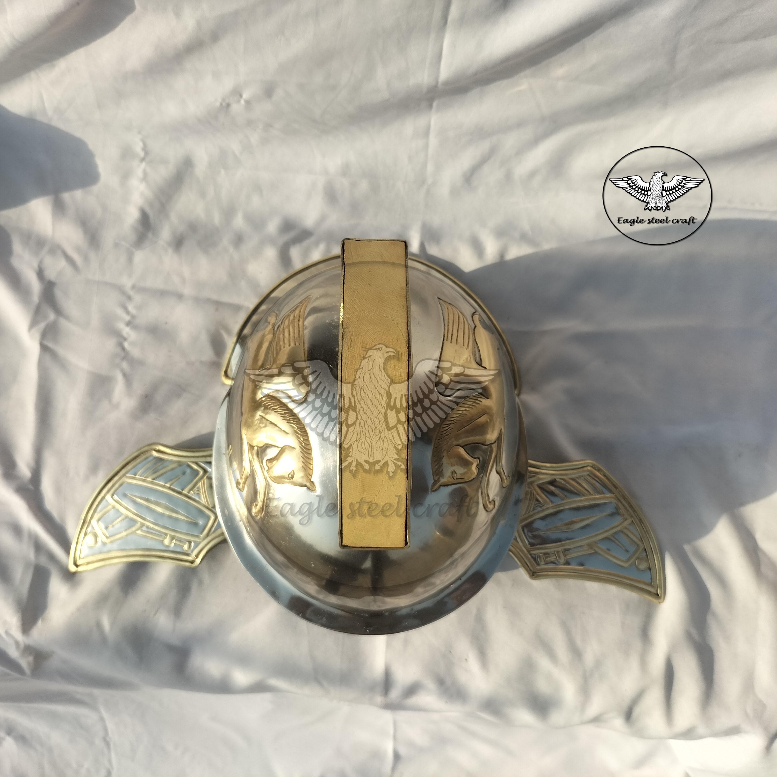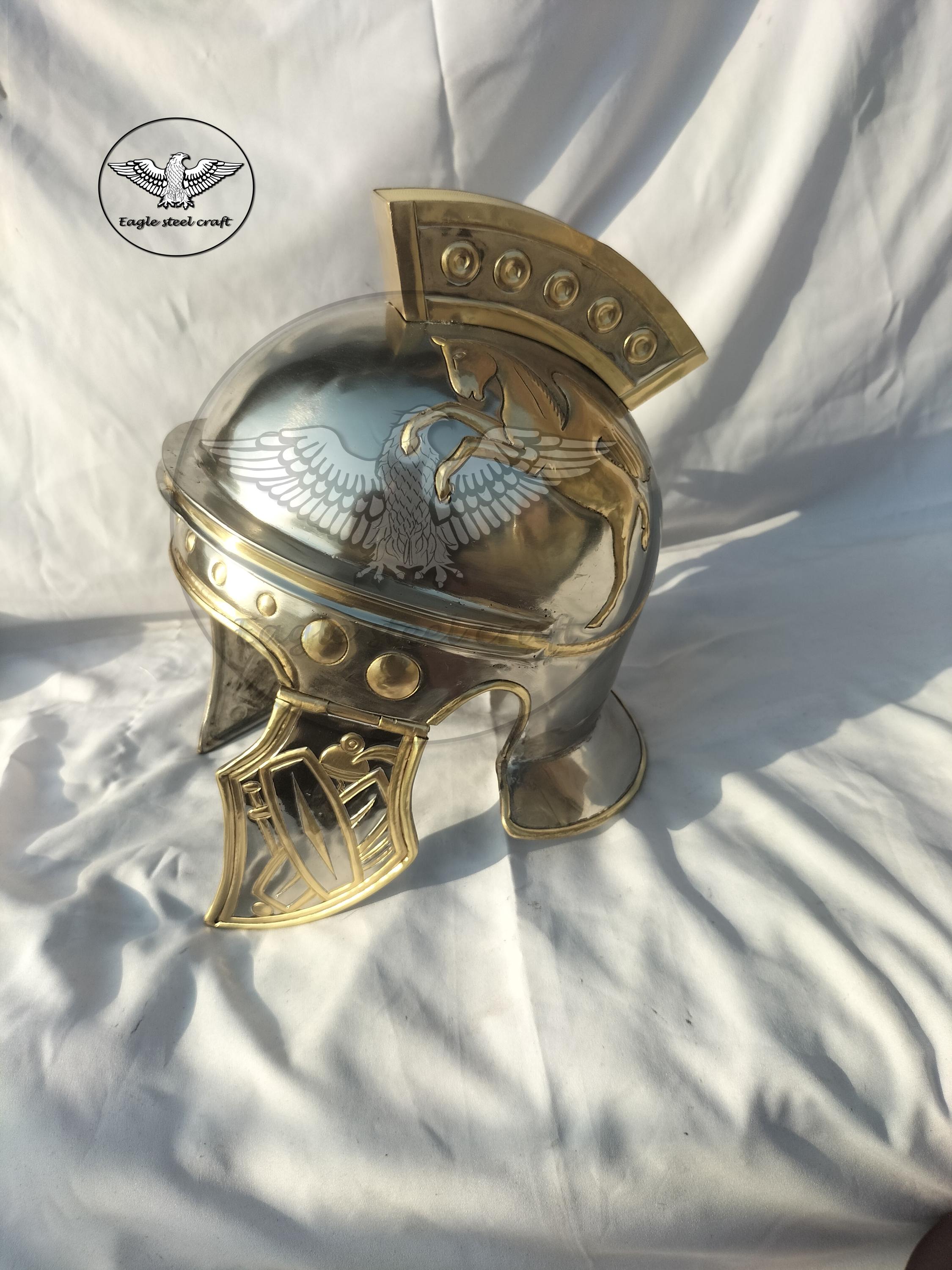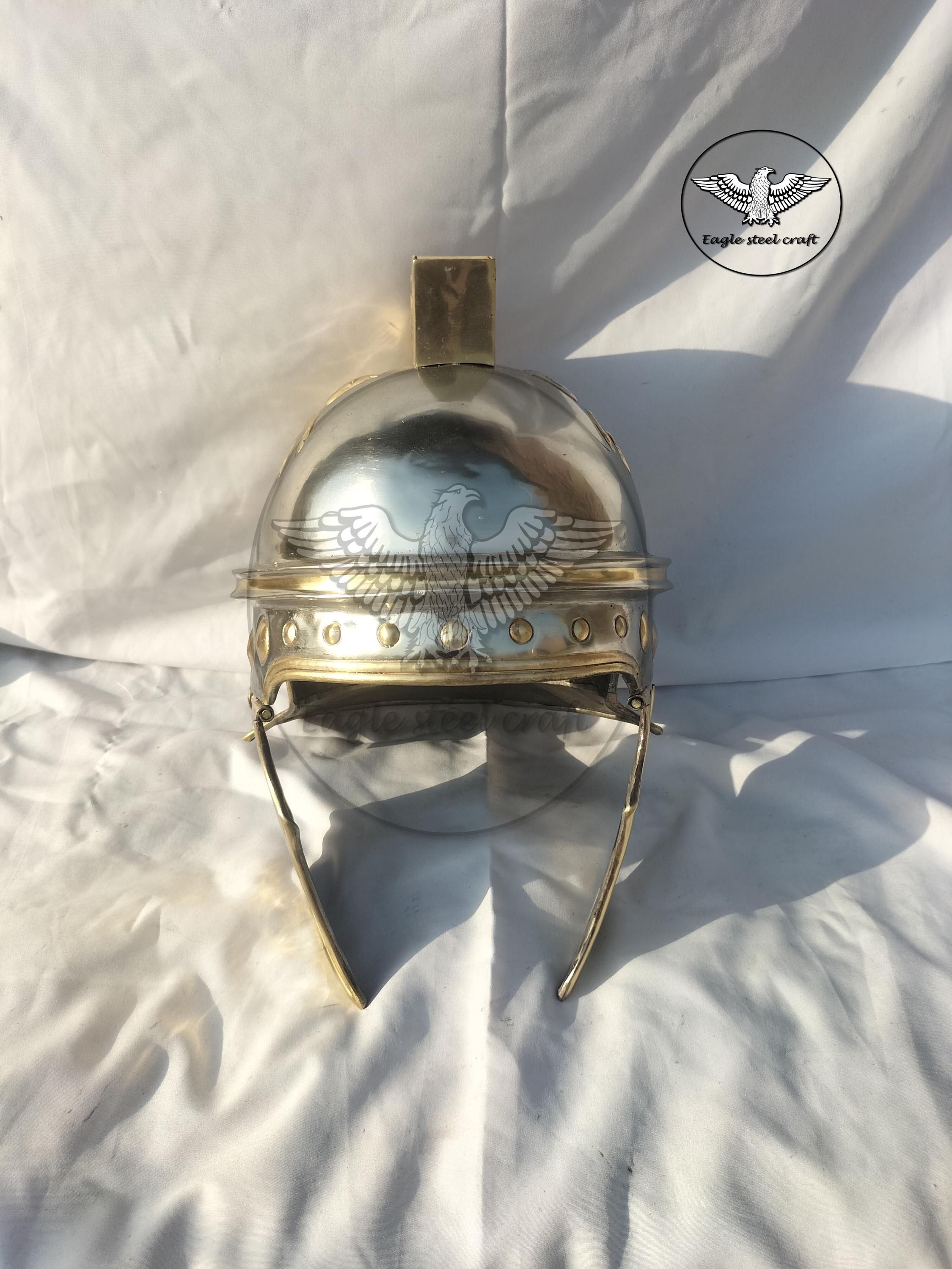 Medieval roman praetorian brass helmet This Praetorian helmet made from historical reliefs of the Flavian Period MARERIAL : Made in 1.2 mm thickness of brass . We will give you a padding for comfortably wearing it.