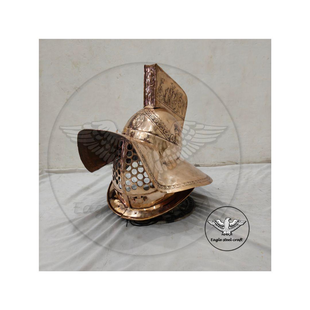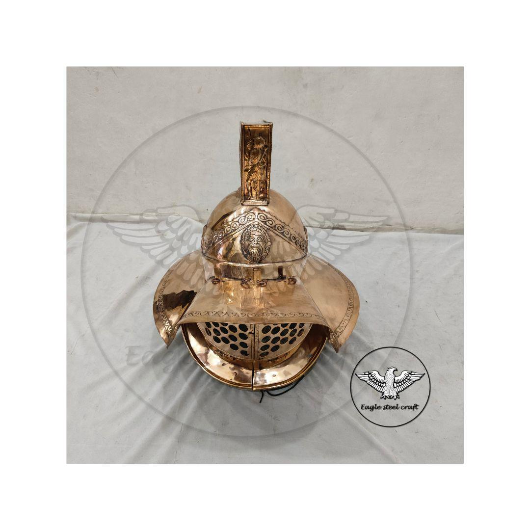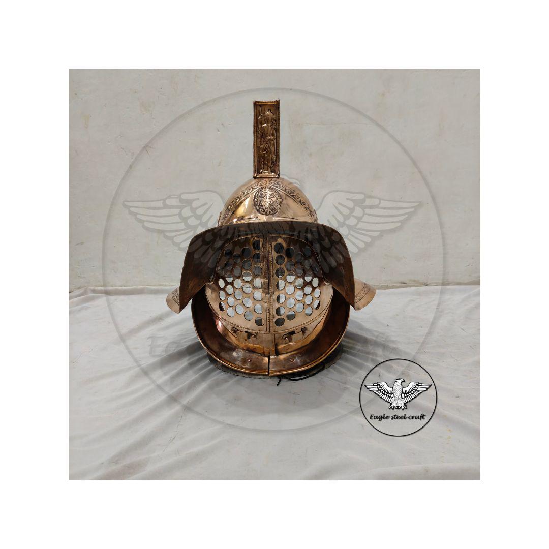 The Bronze medieval Gladiator Murmillo Helmet for reenactment. The thick padding comes with this helmet for comfort wearing. This helmet is absolutely comfortable for cosplay. Mash are made in Thick bronze. You can select you size in variant for comfortably wearing.