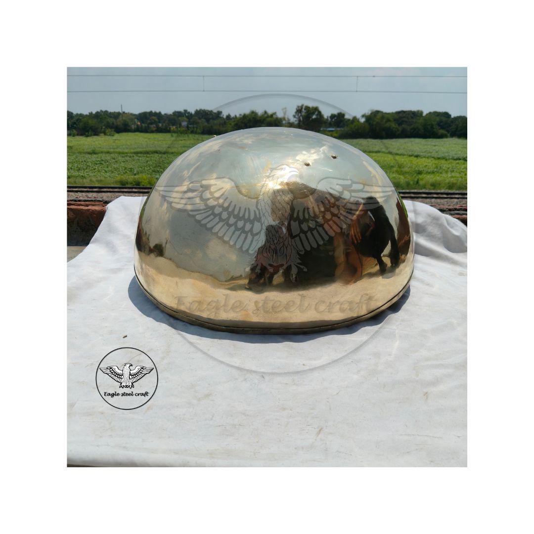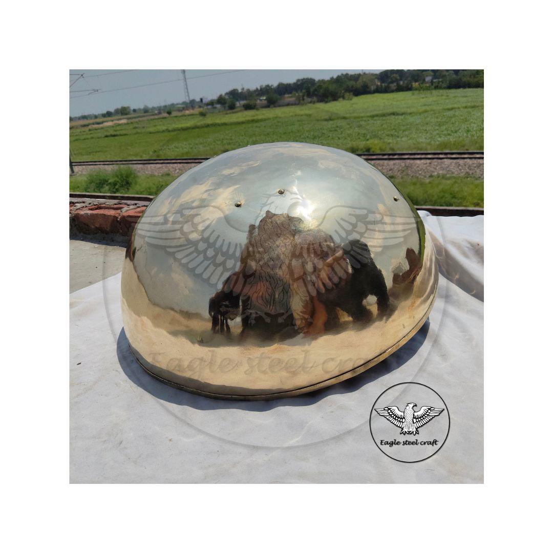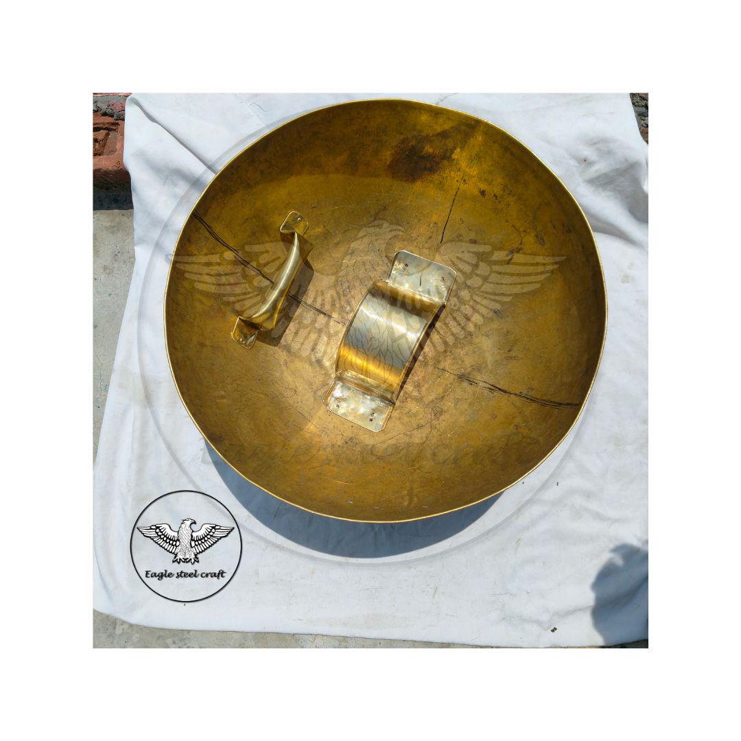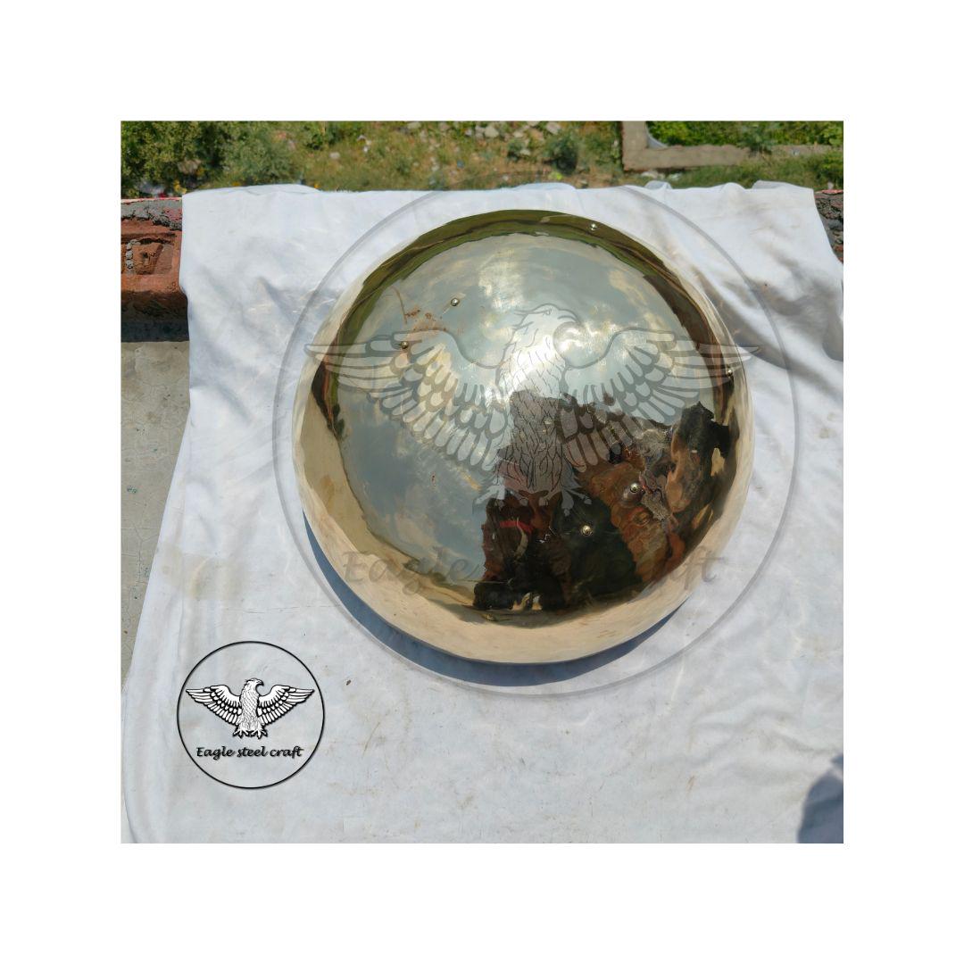 The gladiator type of Hoplomachus Embossed a shield like this in the arenas of the ancient Rome. Ancient Empires Reproductions manufactures the Hoplomachus shield accordingly to finds on the Hoplomachus gladiator type. This shield embossed in one piece by hand. Size : - 50 centimeter diameter. 27 cm depth.