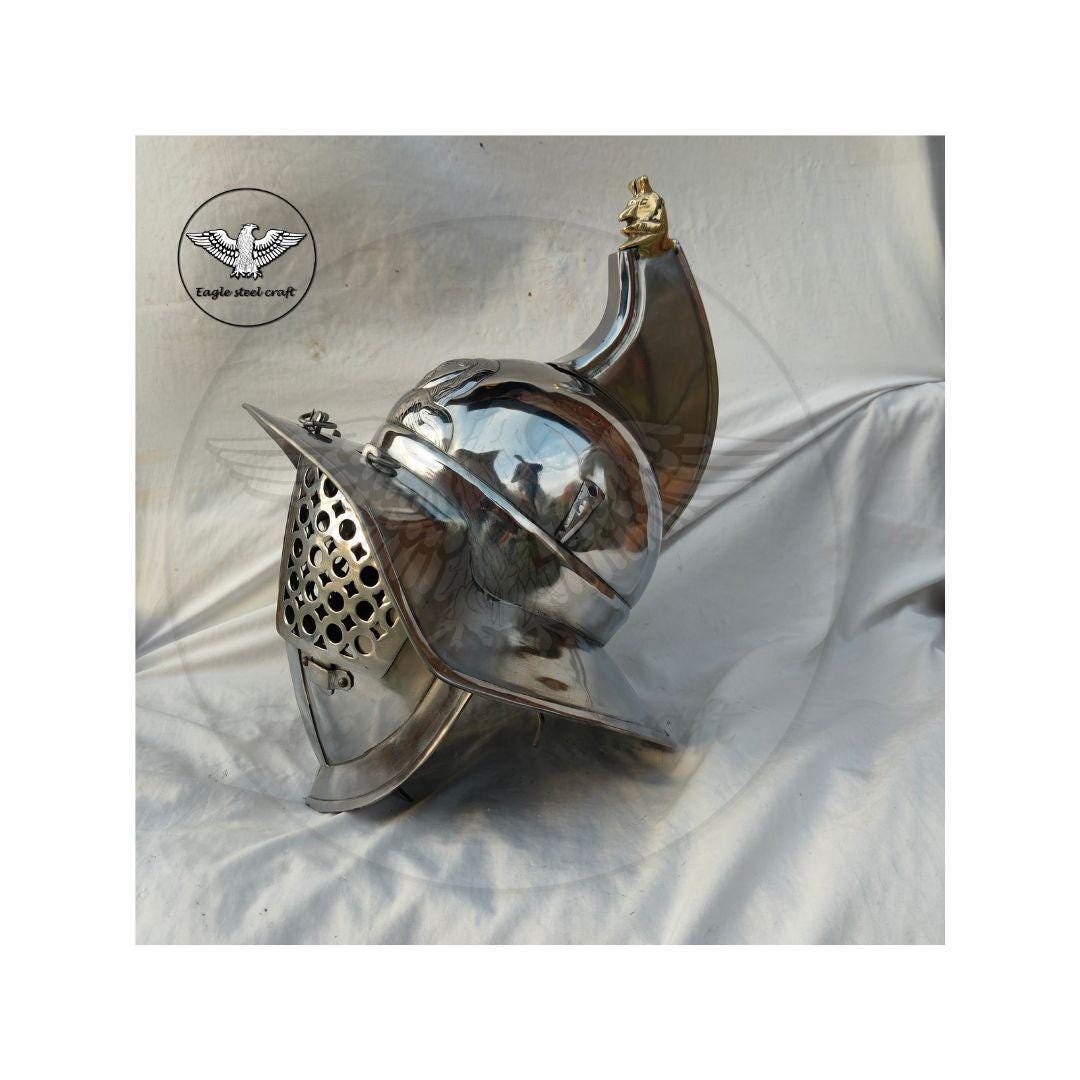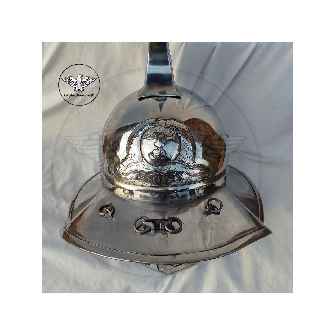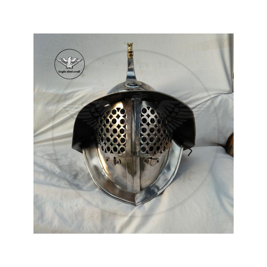 The medieval Gladiator Murmillo Helmet for reenactment. The thick padding comes with this helmet for comfort wearing. This helmet is absalutly comofrtable for cosplay. Mash are made in Thick mild steel. You can select you size in variant for comfortably wearing.