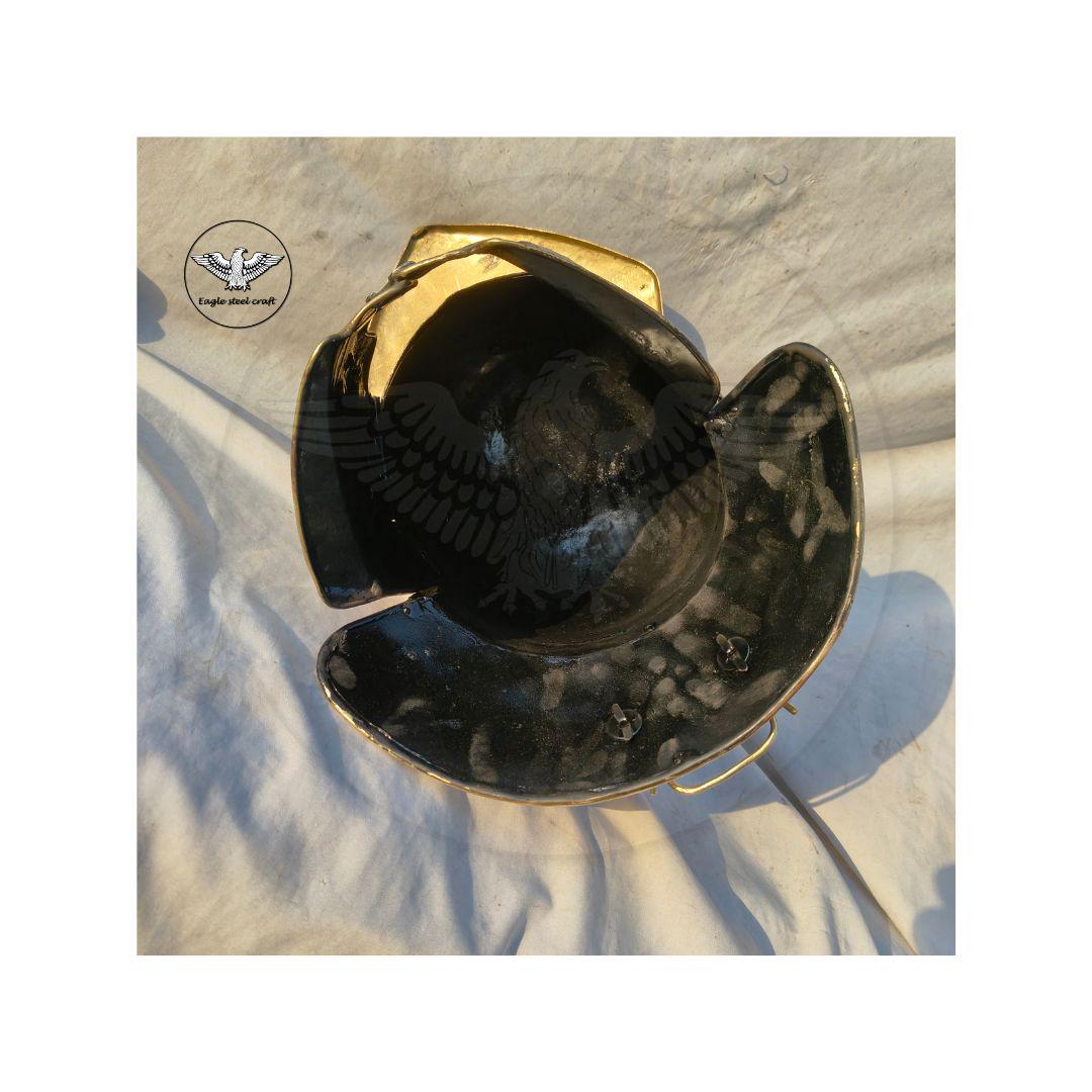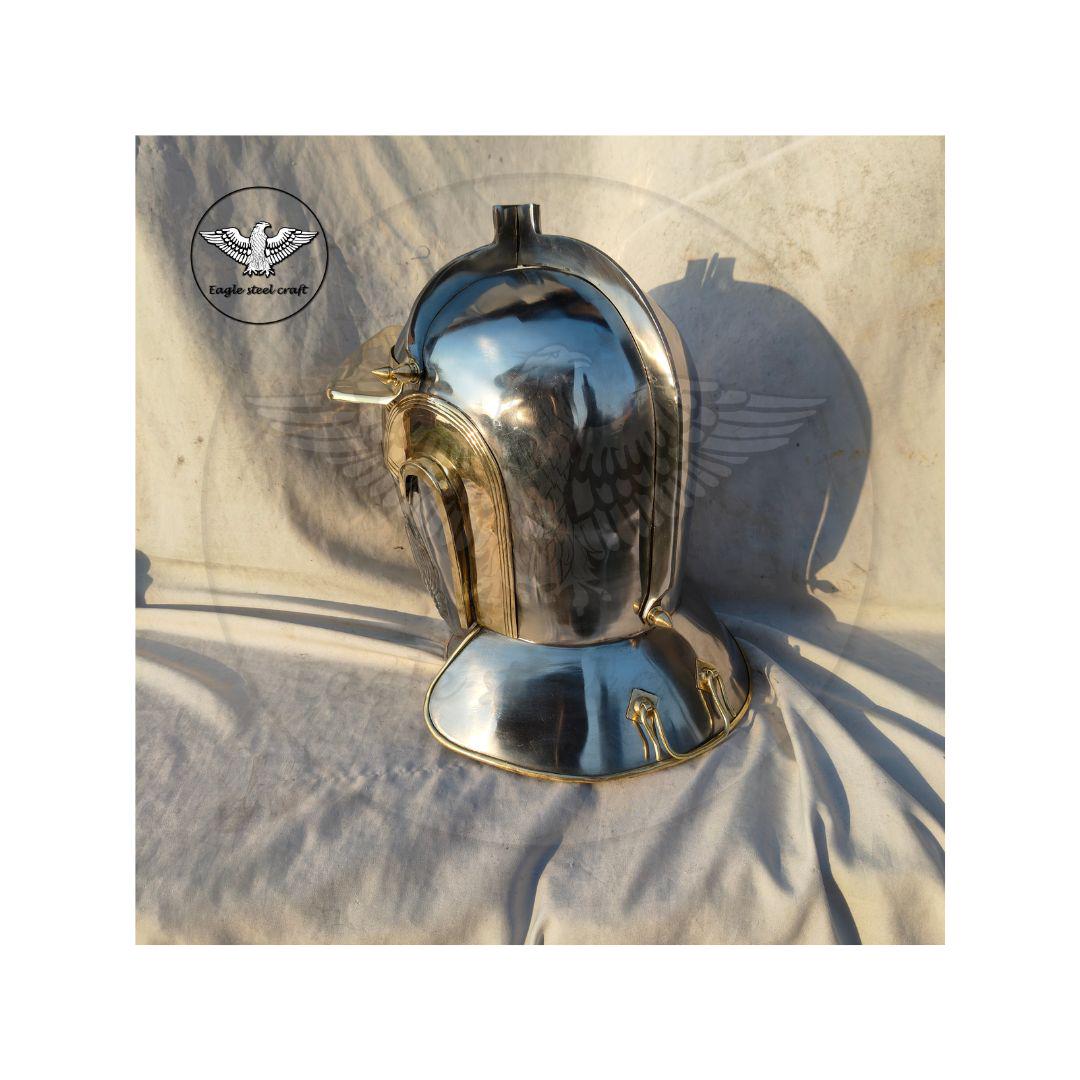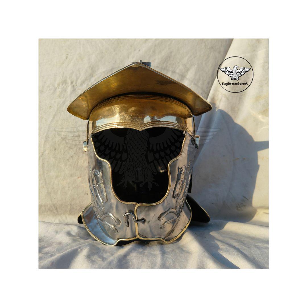 Historians believe it was worn by cavalry as well as by infantry. Comes with silver tin coating for protect from rust. Delivery includes cotton cap for wear underneath. The horse is embossed on both cheeks.