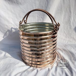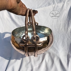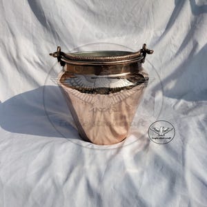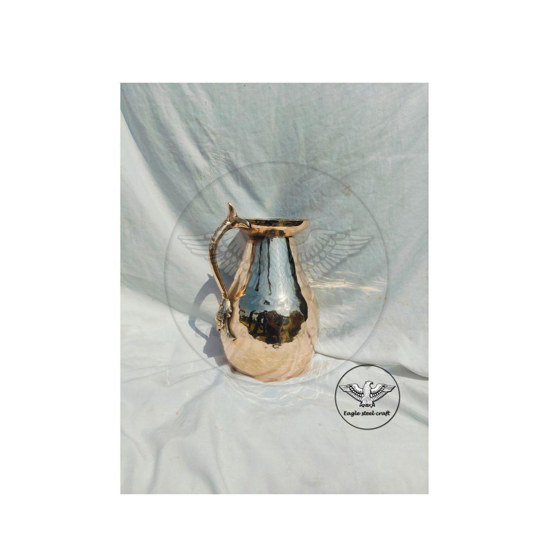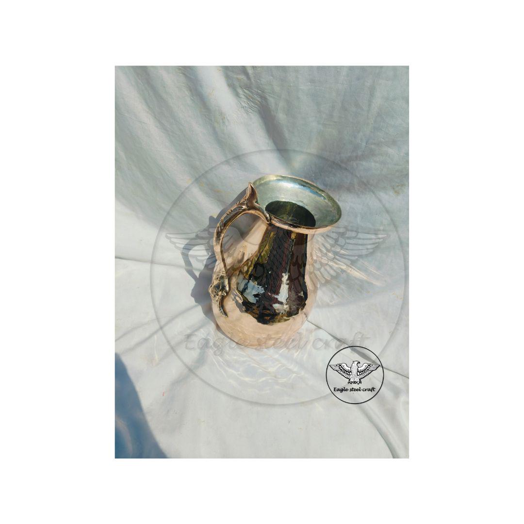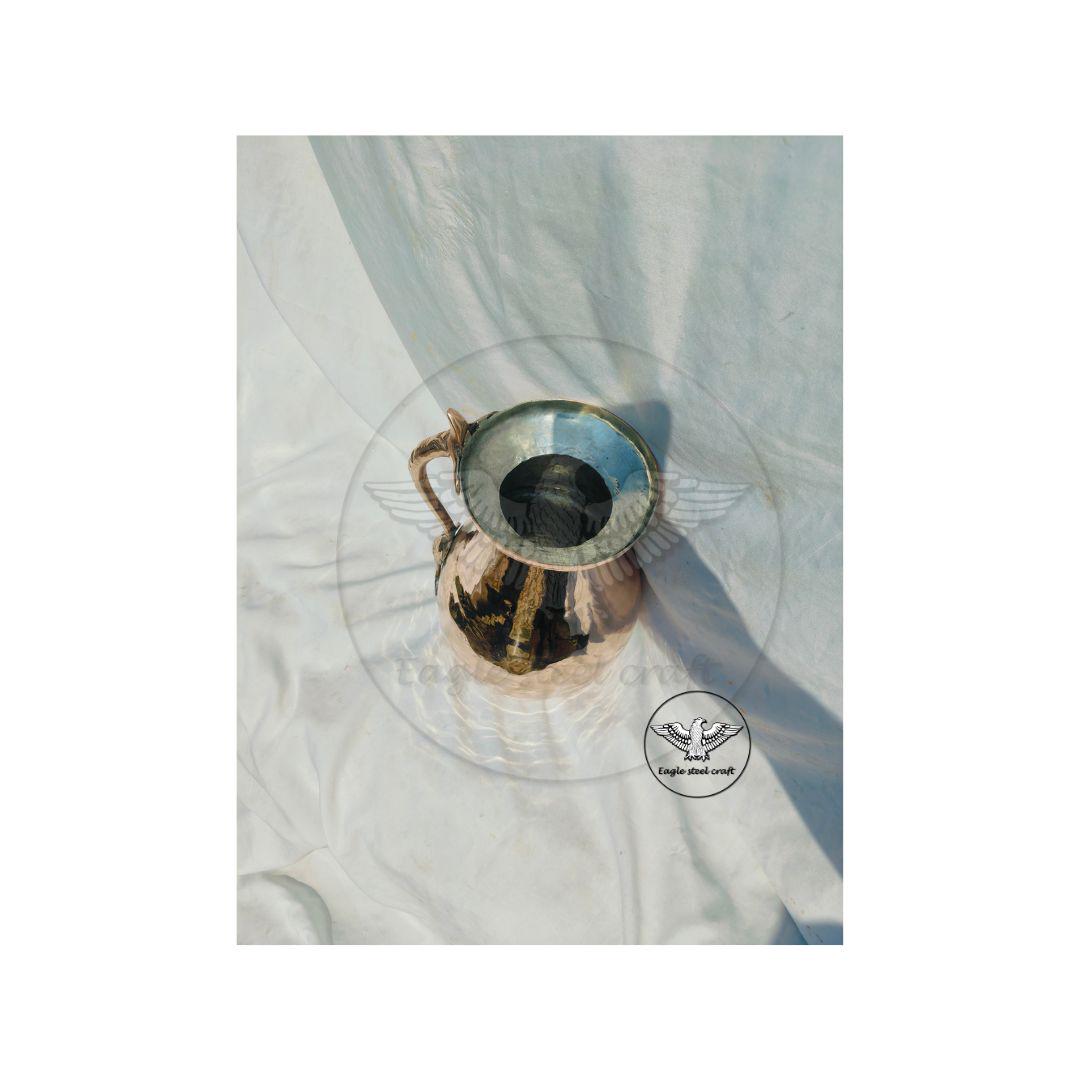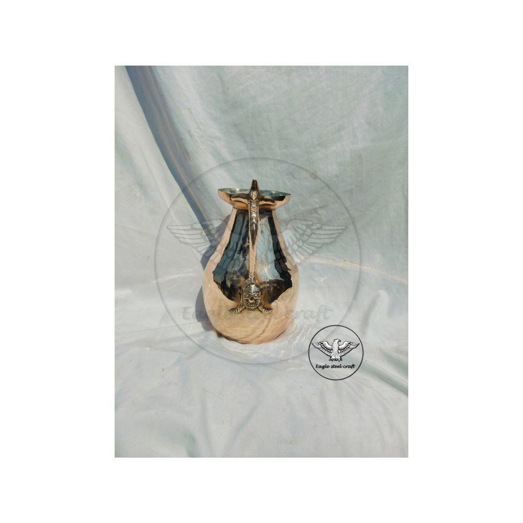 This Jug is made in 1.2 mm thick bronze material, With Bronze casted handle. With tinning finish from inside for healthy use. SIZE :- Total length is - 28 cm. Middle width is - 18 cm. Bottom width is - 12 cm.
